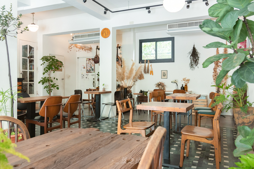 整個空間比我想像得要寬敞多了,也因此每張桌子都有著足以保持舒適的距離,;室內同樣有著許多植栽妝點,或許因為落地窗的採光良好,植物們即便在室內也同樣盎然。各個角落分別有著多種雜誌書籍、陶藝品、樂器等做展示,讓整體氣氛添了不少文藝氣息。