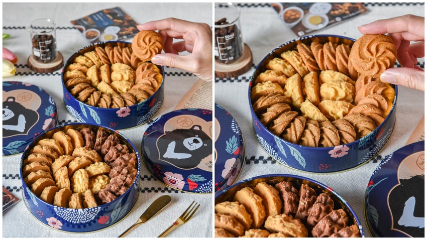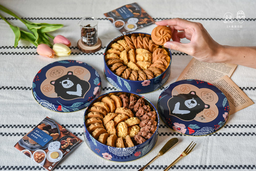 「鴻鼎菓子」曲奇餅是圓鐵盒包裝,深藍色底的鐵盒以台灣特有的黑熊及繡線菊來做設計,因此非常適合國外旅客買來做紀念,而且鐵盒做得很有質感,吃完還可以留著收納使用。