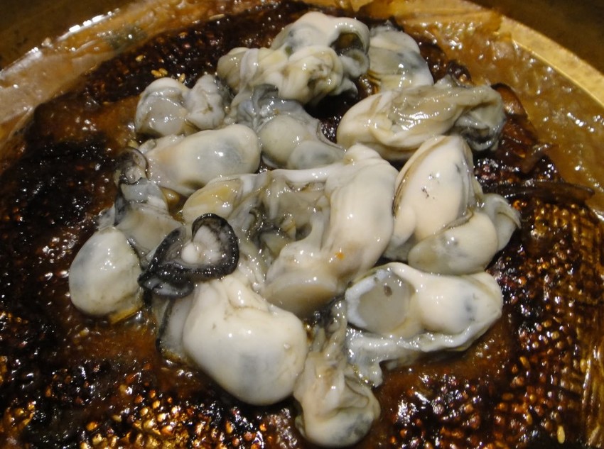 團子則把蚵仔放到銅盤烤肉上進行燒烤,蚵仔肥美飽滿,燒烤後將水份完全鎖住,入口後的蚵仔在口中爆漿,甘甜豐腴,海味十足。