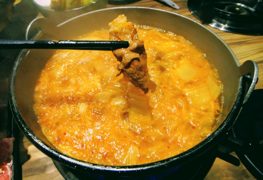 「霜降牛」大理石油花分布均勻,在泡菜湯鍋涮幾下就可入口,嘗起來肉質鮮美嫩口;「沙朗牛」肉質細嫩略有嚼勁,滑嫩不乾柴,甜香氣息占據整個味蕾,讓人一片接一片,完全擄獲人心。