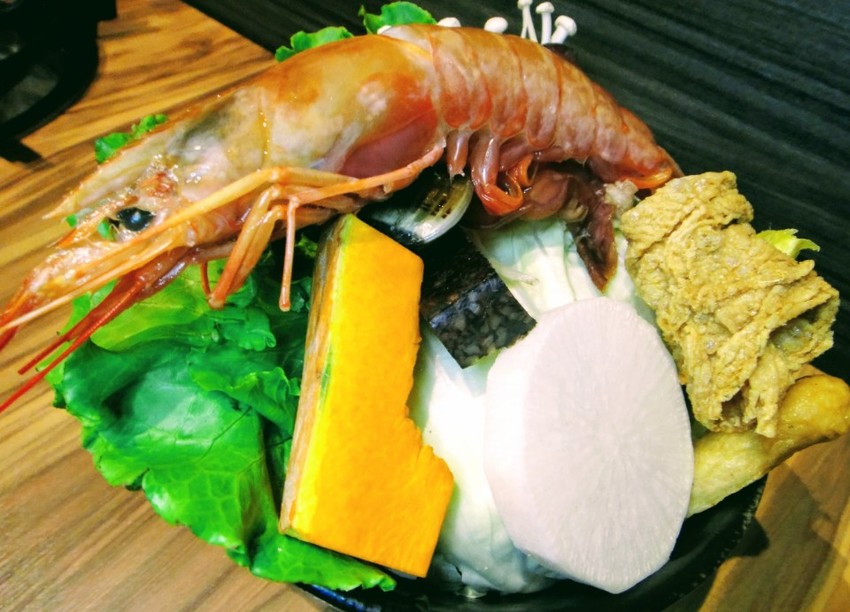 店家近期活動只要點火鍋套餐,菜盤還附贈一隻長度比手還大的「天使紅蝦」,產自阿根廷的「天使紅蝦」更是畫龍點睛的主角,肉質扎實脆口,Q彈有咬勁,紅蝦入鍋後也讓湯頭更鮮甜味美,開胃又暖和。