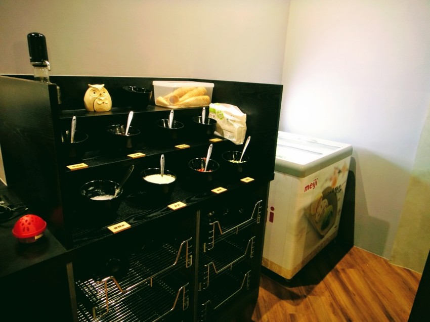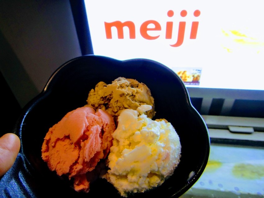 店家也提供Meiji冰淇淋,4種口味都有特色,還有台灣人喜愛的黑糖珍奶口味,不論是直接吃或用餅乾搭配,都十分對味。