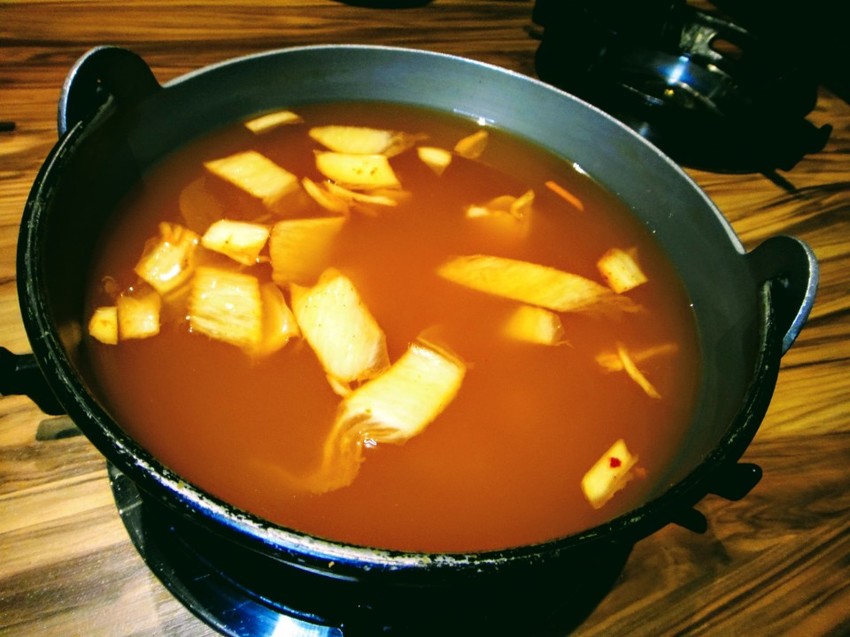 「咕咕咕嚕大安店」的湯頭有經典昆布鍋、日式味噌鍋、韓式泡菜鍋、牛奶鍋、麻辣鴨血鍋,團子點的是「韓式泡菜鍋」,韓式特製泡菜入鍋,酸辣中帶出淡淡甜味。