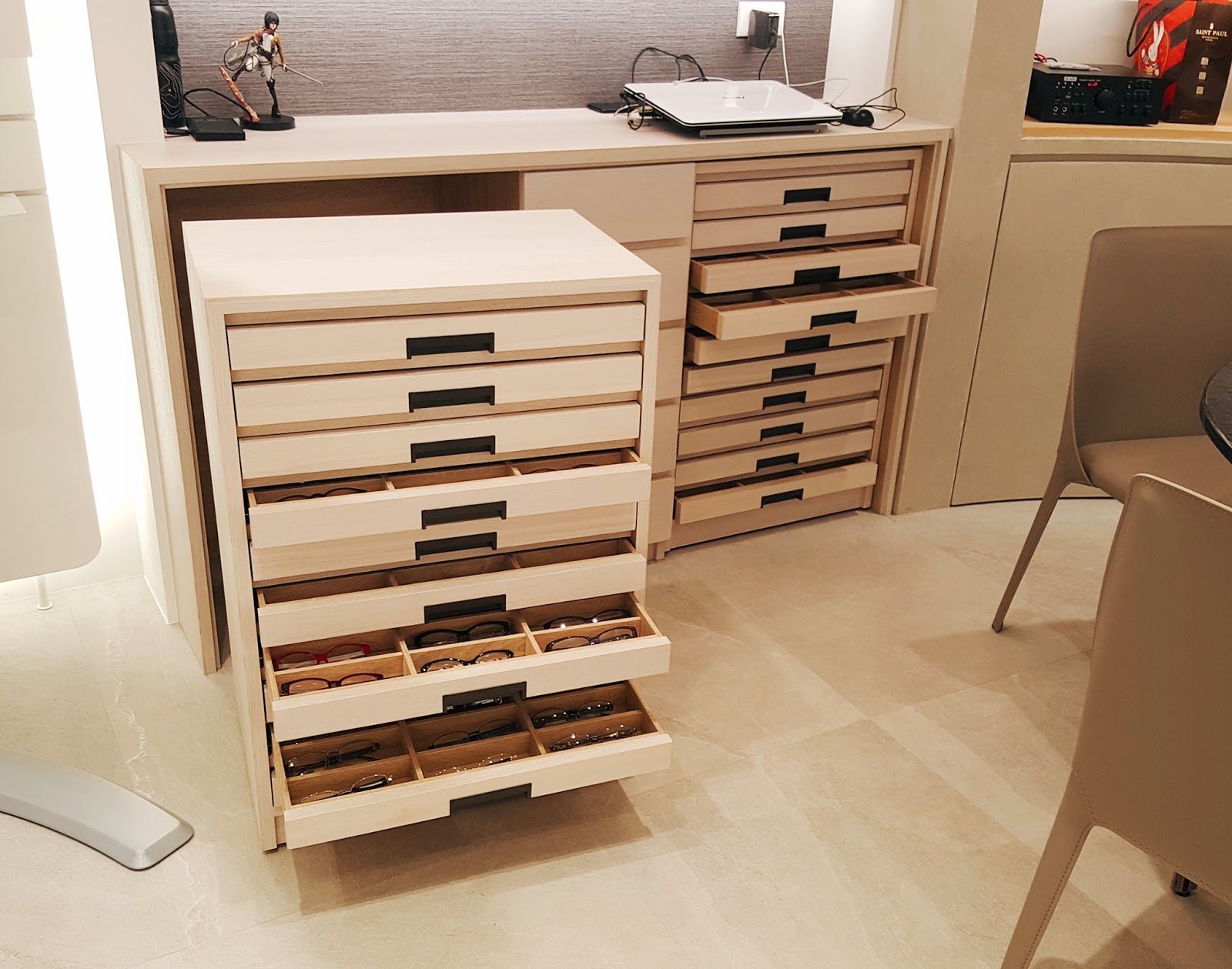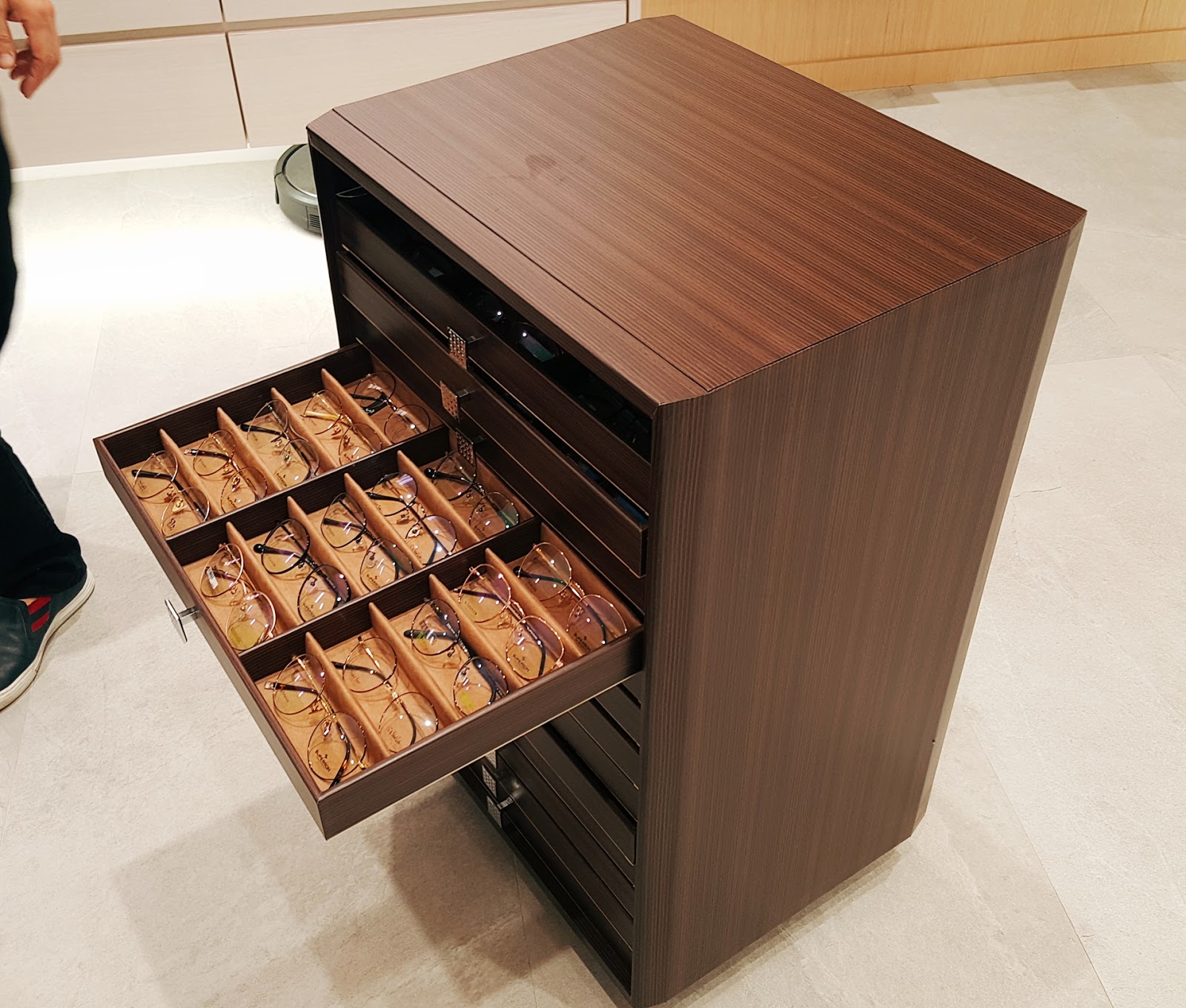 老闆娘還設計了活動眼鏡櫃,遇到像我一樣有選擇障礙,挑鏡框比挑老公還困難的客人,可以把活動櫃推到桌子旁邊,讓我坐著挑!