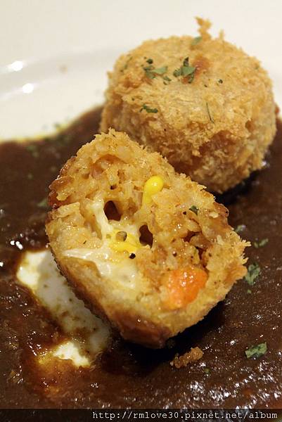 咬開之後,可樂餅裡的飯粒咬勁不錯,裡面還有起士溶在飯裡