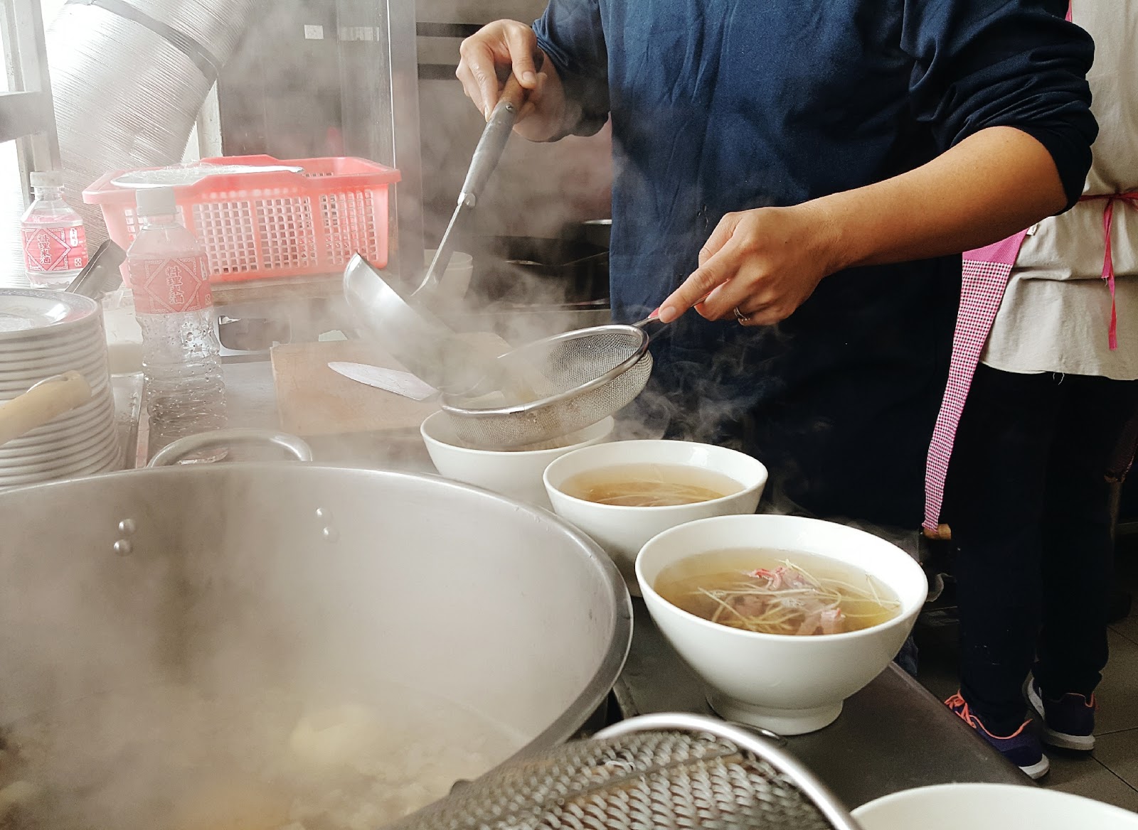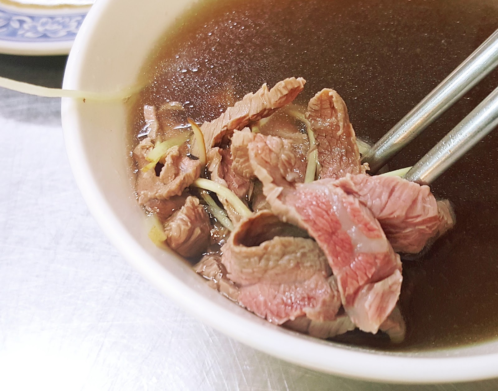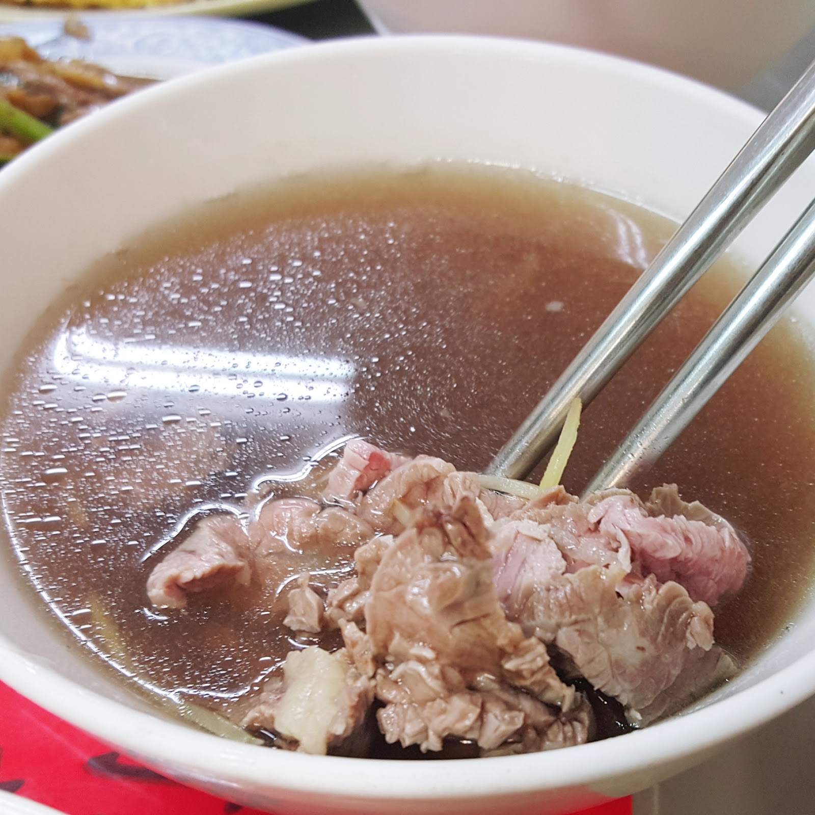 其他的肉片直接將切好的生肉放在碗裡,用滾燙的熱湯一沖就立刻上桌。老闆在倒熱湯的時候還特別使用篩子,以過濾湯頭裡的雜質,讓牛肉湯口感更清澈。