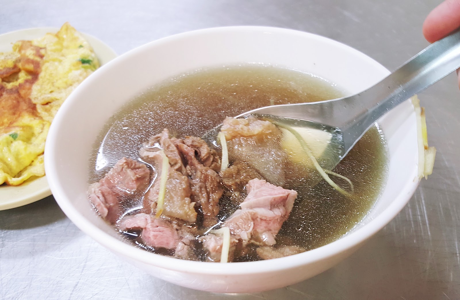 因為加入了牛肉,上桌時湯頭的顏色變得比較深。先嘗一口熱湯,蔬果帶出甜味,和著牛骨、牛肉的香氣,再加點薑絲提味,湯頭溫潤甘甜。好喝的湯頭喜歡的話一樣可以跟老闆說:再來一碗!