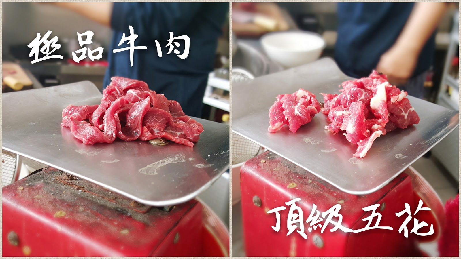 湯品的牛肉老闆都是現點現切,極品牛肉湯用的是瘦肉,相較之下頂級五花湯稍微肥些。新鮮的生牛肉色澤鮮紅,富有彈性及漂亮的光澤。