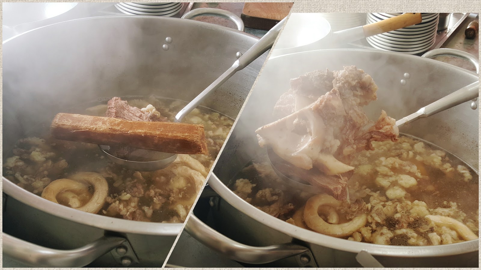 湯底有什麼呢?老闆大方公布配方,整隻的牛大骨和量大又種類多的蔬果一起熬煮,有看出來嗎?左邊那張是一支切段的甘蔗!整鍋冒著熱氣香氣的湯頭光聞著就覺得溫暖。