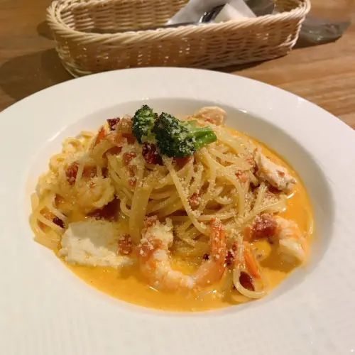 我點南瓜鮮蝦雞肉筆管麵,整個就很對我的胃,因為筆管麵帶有咬勁,南瓜醬的味道也很濃卻不會感到不舒服,雖然蝦子大小不一,但吃了沒過敏,雞肉就稍微可點,比較柴一點。整體上都讓人很喜歡的一道料理。