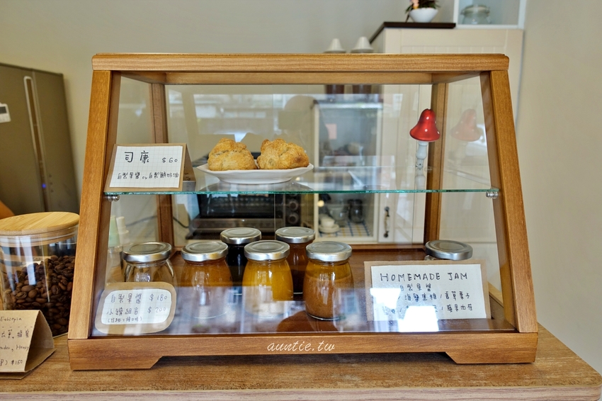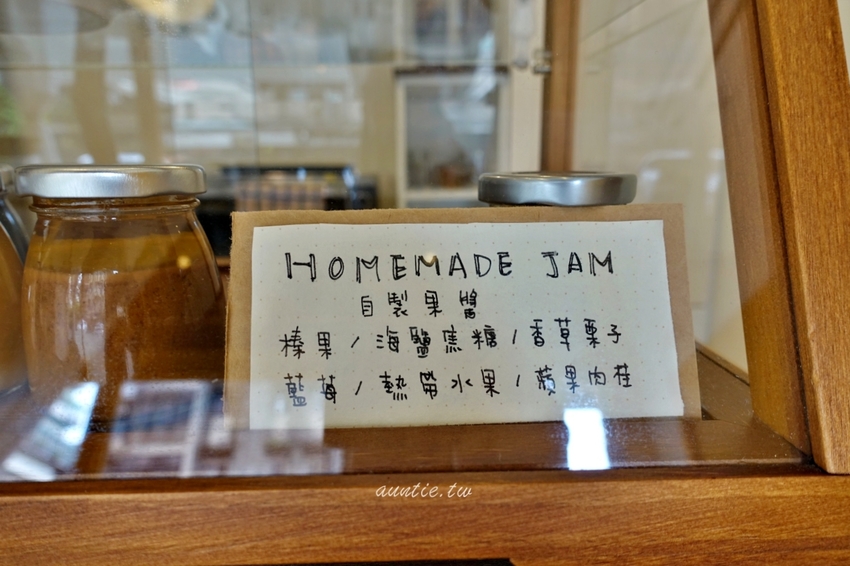 店裡的餐點有鹹點三明治,也有甜食法式薄餅、司康,比較特別的是分別搭配的果醬,都是店家自己做的,本來想點熱帶水果法式薄餅的,可惜這天沒有,不過有剛做好的顆粒花生抹醬,聽另外一桌客人說好吃就點了下去。