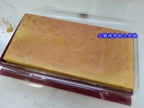 蛋糕用透明紙包著,若想要拿出來切可以直接將透明紙整個提起來,一整個相當方便,盒內也會附上一個塑膠刀,撕開透明紙時,就可以聞到濃濃的奶油香味,光看帶點油亮感淺褐色的蛋糕表層就十分吸引人,很綿密美味的樣子