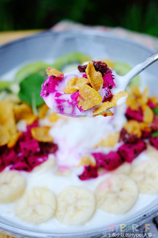 碗裡的優格是原味優格,如果覺得不夠甜可以再自己另外加入一旁附的蜂蜜喔~搭配新鮮水果吃起來真的好清爽,加上穀片又更增加口感吃起來不無聊