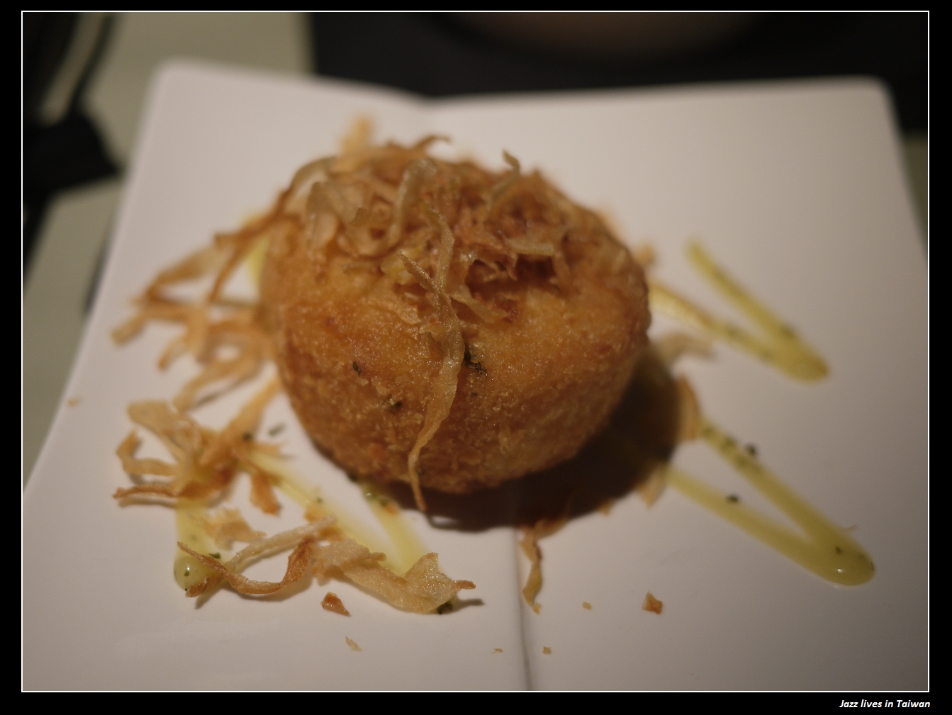 香蔥鮭魚炸飯糰, 脆脆的飯糰皮搭配洋蔥絲, 沾著蜂蜜芥末醬, 還不錯吃, 只不過廚師的醬給的很小氣, 還吃不完飯糰醬就被沾完了, 且上菜時已經冷掉了, 可以的話, 熱一點會比較好吃唷! 同一道菜就嚐到了好吃與不好吃的做法!