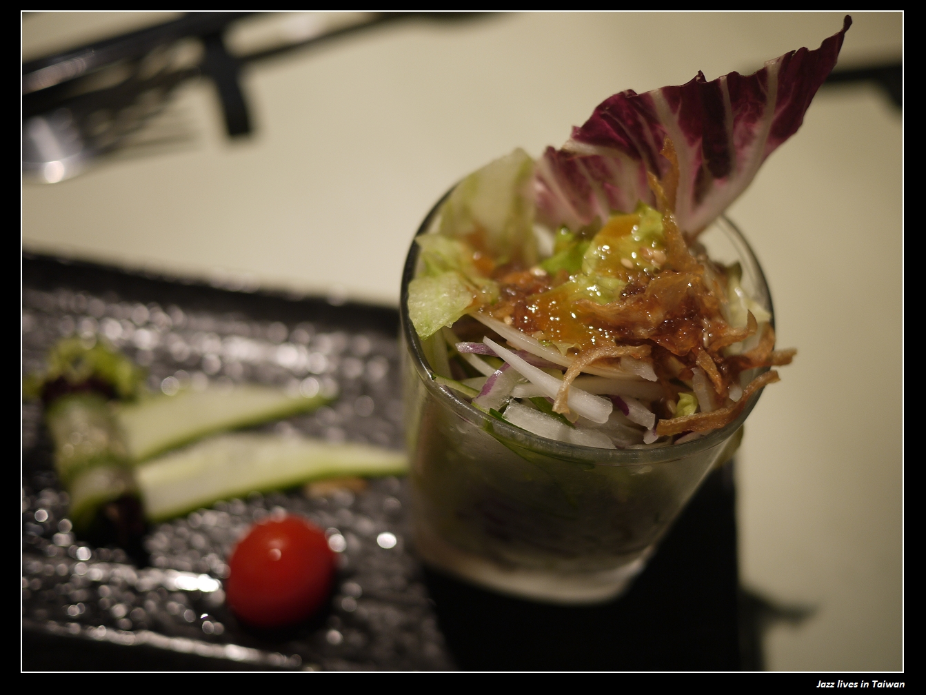 前菜, 我這次還是點了碧綠牛肉沙拉, 沙拉醬汁酸酸甜甜, 淋到沙拉杯中, 搭配杯中的蒜片與洋蔥, 生菜, 牛肉, 非常開味,
