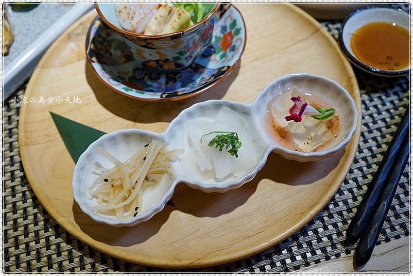 搭配的三款小菜也會不定時的更換唷!! 這天是涼拌牛蒡、柚子蘿蔔、紫蘇梅水晶凍等,都是清爽開胃的小菜!!