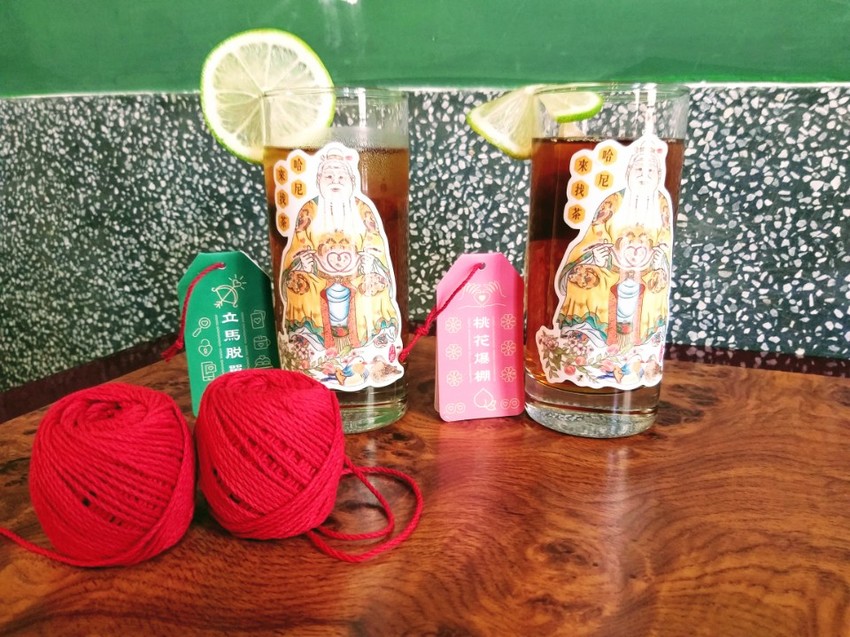 「哈尼來找茶」店家使用月老姻緣簿茶蜜組食材,選用荔枝蜂蜜及斯里蘭卡紅茶特調的蜂蜜紅茶,入口後甜香氣息繚繞口齒之間,經過月老加持讓你更加蜂情萬種,締造美好的姻緣。