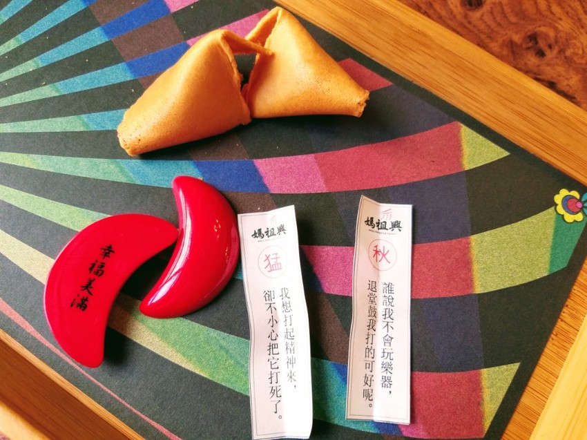 造型如擲筊的「黯然籤詩餅」,剝開後都有一句黯然語錄,籤詩趣味又幽默,讓人不禁會心一笑。