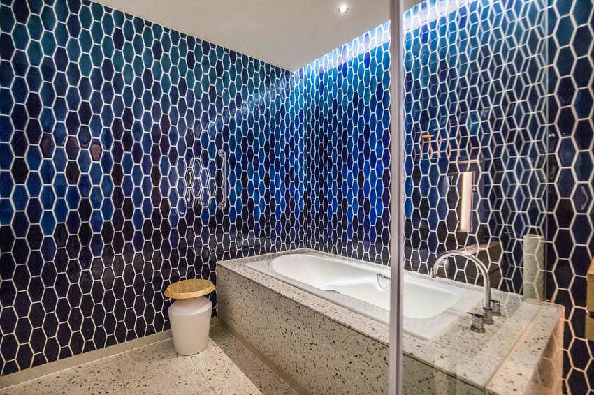 浴室也是我們貼選飯店的重點之一,超豪華房的面積超大,同樣也很有設計感,跳色的磁磚加上間接光源的照明,浪漫但不浮誇,且配置浴缸,面對高雄熱情豔陽,滿身大汗回到房間,沖冷水澡,泡進暖呼呼的熱水裡最爽了!