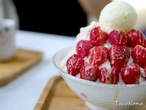 小山園抹茶粉撒在綿冰上,彷彿岸邊的綠藻,吃起來口感柔滑,以自然農法種植的萬丹紅豆,加上在地媽媽用心熬製的蜜紅豆,顆顆飽滿,無破損,非常好吃。跟抹茶意外地搭,吃不夠,店家還另外盛一鍋,可以再加。