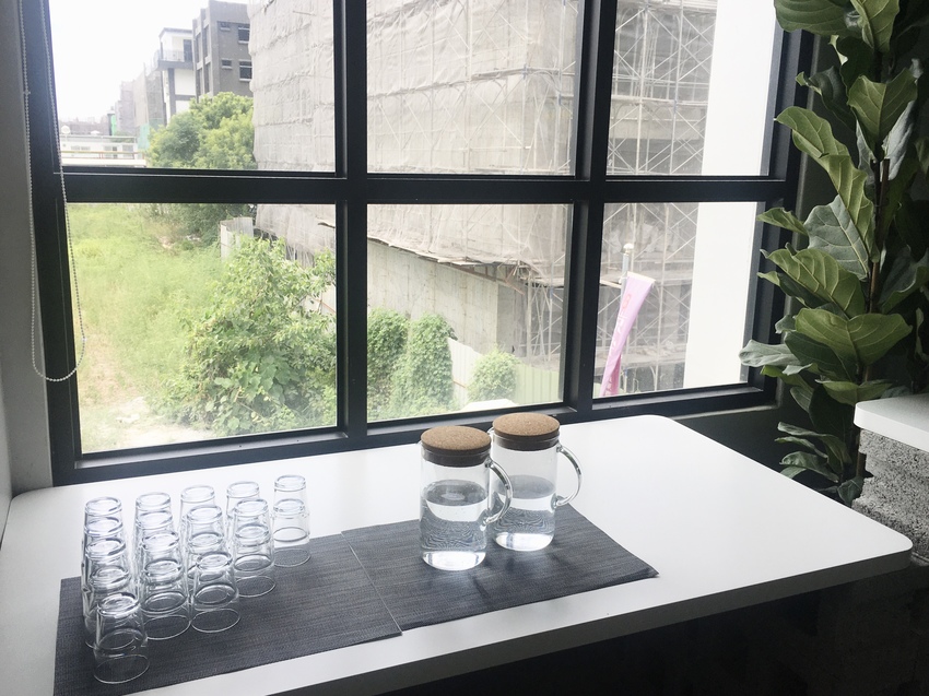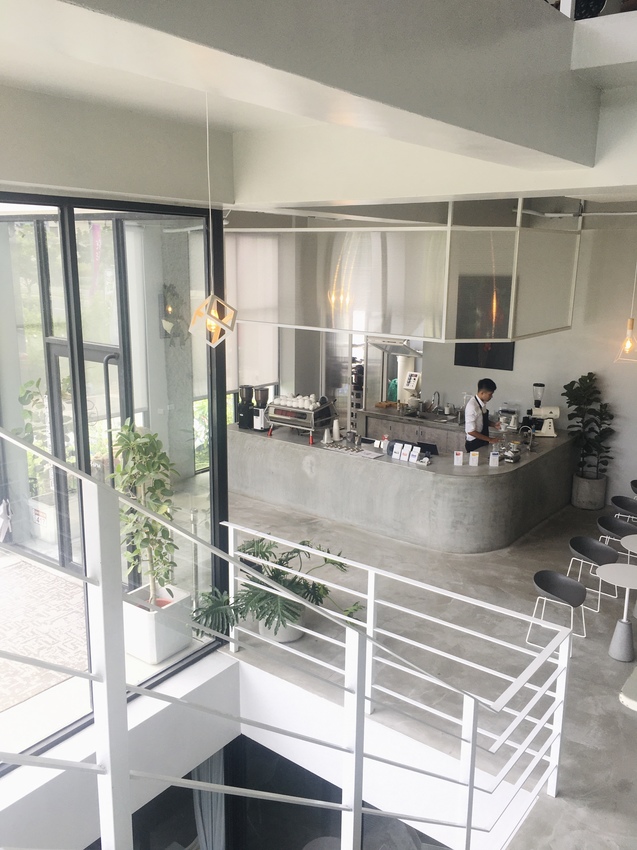 店內的風格也是一致的清爽簡約,水泥質地與綠意植栽碰撞出沉靜的氛圍,一進門就讓人感受到無比的放鬆和舒適感,全店採用自助式服務,在櫃台拿菜單後可以自行尋找喜歡的位置坐