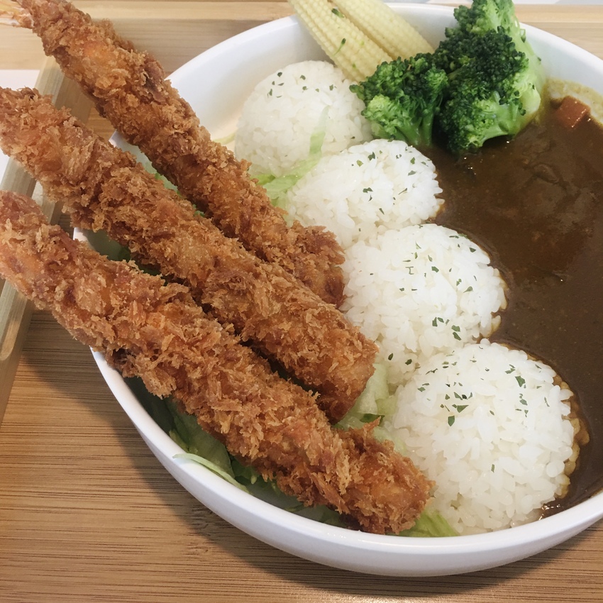 很少看見炸蝦咖哩的組合,三隻炸蝦排排站擺在碗裡顯得霸氣十足,吃起來表皮酥脆肉質Q彈,這碗份量感十足,吃完整個超級飽。
