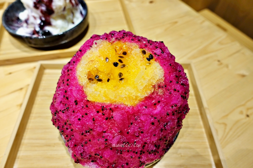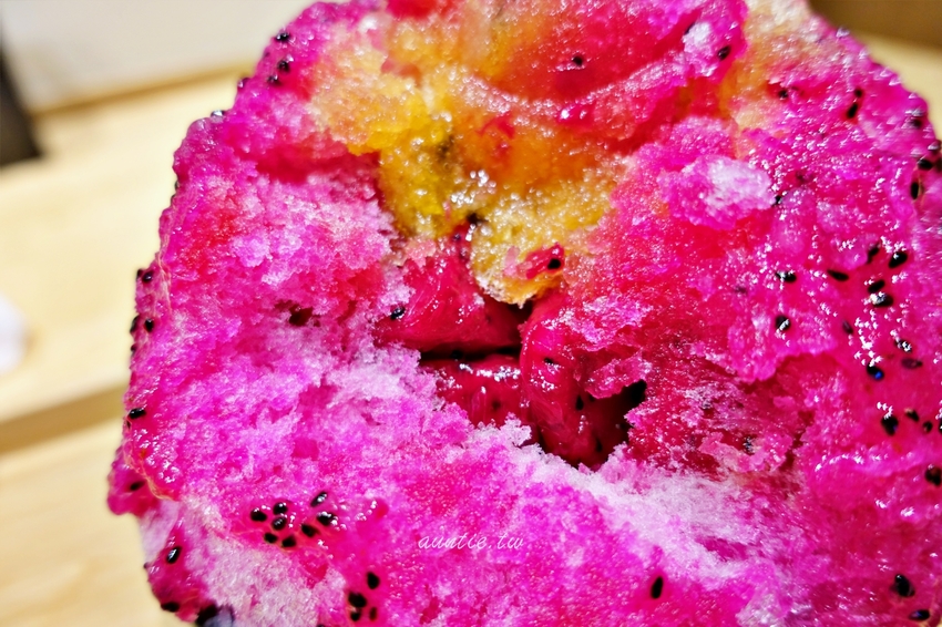 圓滾滾的外型真的挺吸睛的!上頭是百香果醬,四周是火龍果汁加上裡頭的新鮮火龍果,非常清爽消暑,百香果醬搭上自然新鮮的火龍果,味道真的很棒,不甜不膩,都是新鮮水果的味道,超推!