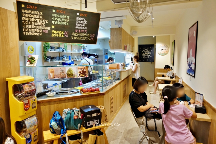 初雪冰品位於小巷弄內,外觀跟裝潢都帶著點日式風格,門口的打卡牆是用粉餅畫的,色彩繽紛,很有特色耶,