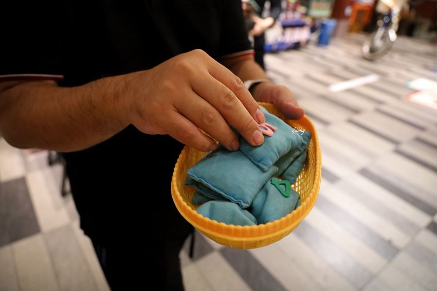 這沙包是拿來挑戰九宮格的,拿著沙包把機器人身上的數字一個個打下來,覺得超有成就感的!