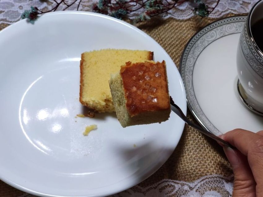 明顯可以看出五三燒的顏色比起一般市售長崎蛋糕來得深濃,雖然SIZE比較迷你XD,不過濃郁綿密看得見,底部的糖粒當然更是特色,是目前其他台灣市售長崎蛋糕中比較少見的。