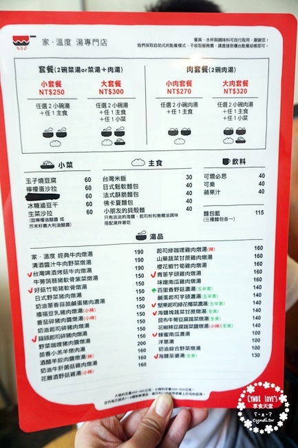 家.溫度 湯專門店的餐點有分大小套餐,基本的小套餐就是任一主食再加上兩碗的湯品,看是要兩碗菜湯、一菜湯一肉湯、或是兩碗肉湯,大套餐就是額外可以再選任一小菜,主食小荻推薦台灣米飯,湯品就是要配飯才對,尤其是濃湯,這樣搭超好吃,不收取服務費。