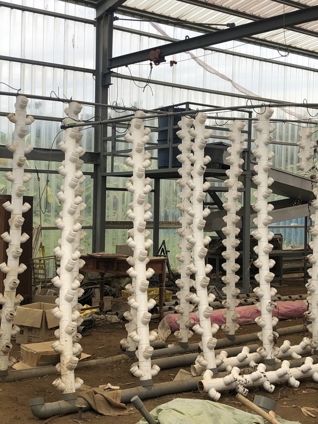 下圖所看到的白色水管,為老闆耗時多年完成的立式水耕蔬菜種植法之器具,於去年拿到專利實在非常厲害。