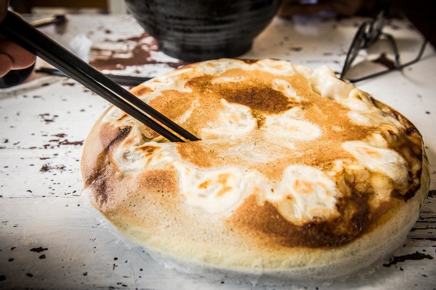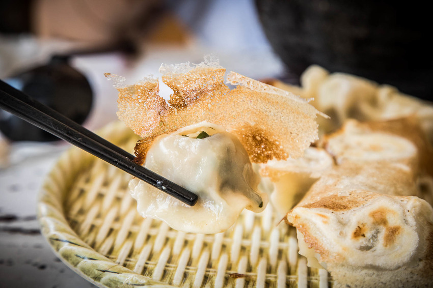 煎餃帶焦脆薄翼麵衣,用筷子就可以輕鬆分開餃子,筷子一接觸可以感受到冰花麵衣薄脆的觸感,夾起一個餃子,薄到可以透光!超美的!