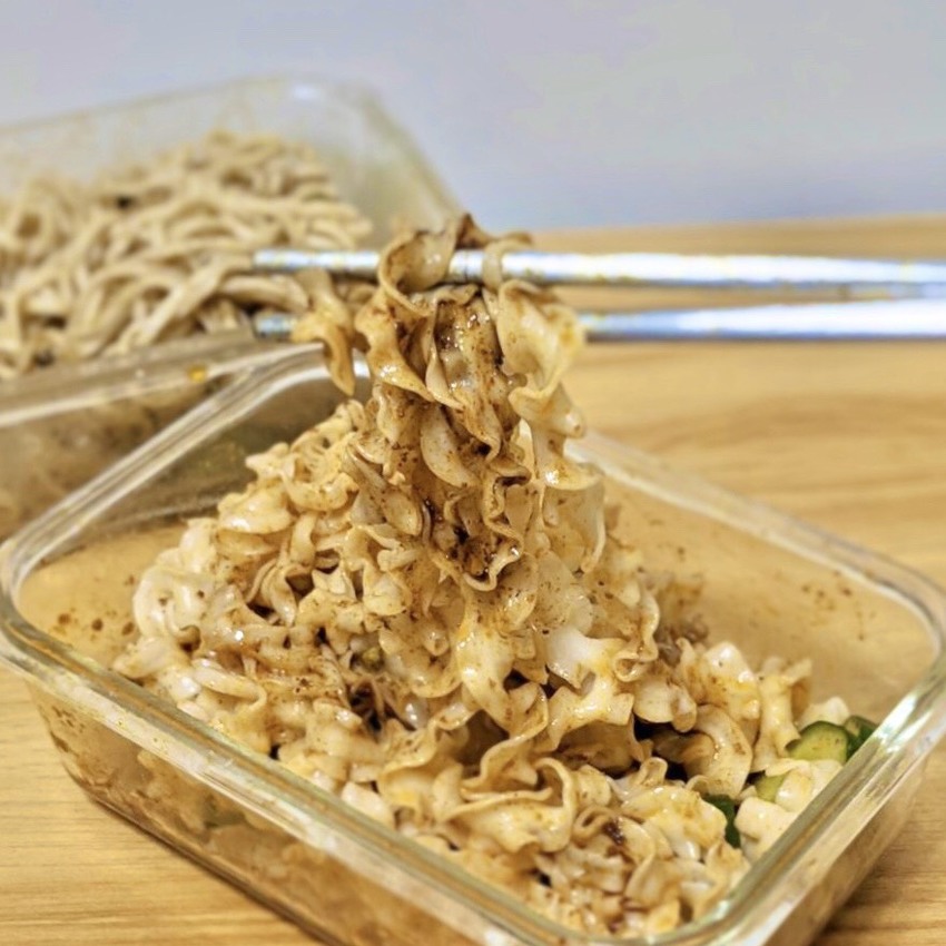 芝麻拌麵的麵體使用手打細麵,芝麻醬非常濃稠,倒入油包後增添了整碗的滑順感及濕度,