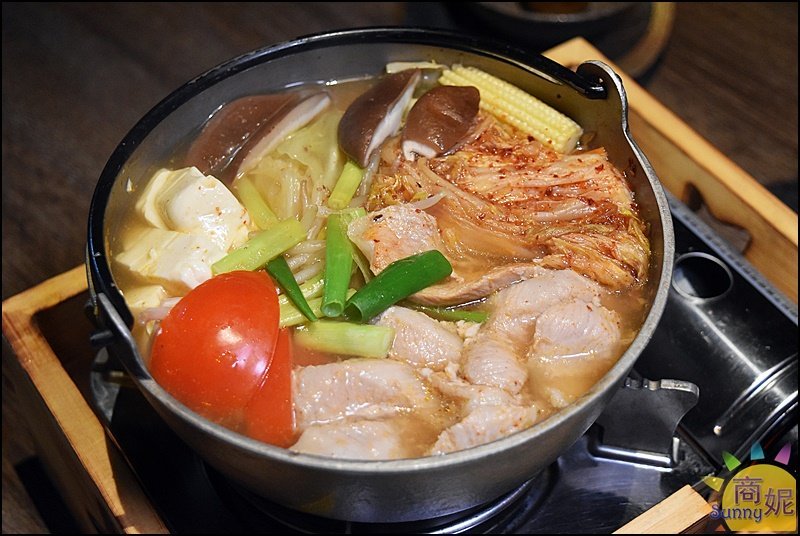 主廚自己醃製的韓式泡菜,煮火鍋湯頭很夠味,加上厚切的松阪豬肉及其他配料,這一鍋韓式泡菜鍋光是看就覺得好吃。