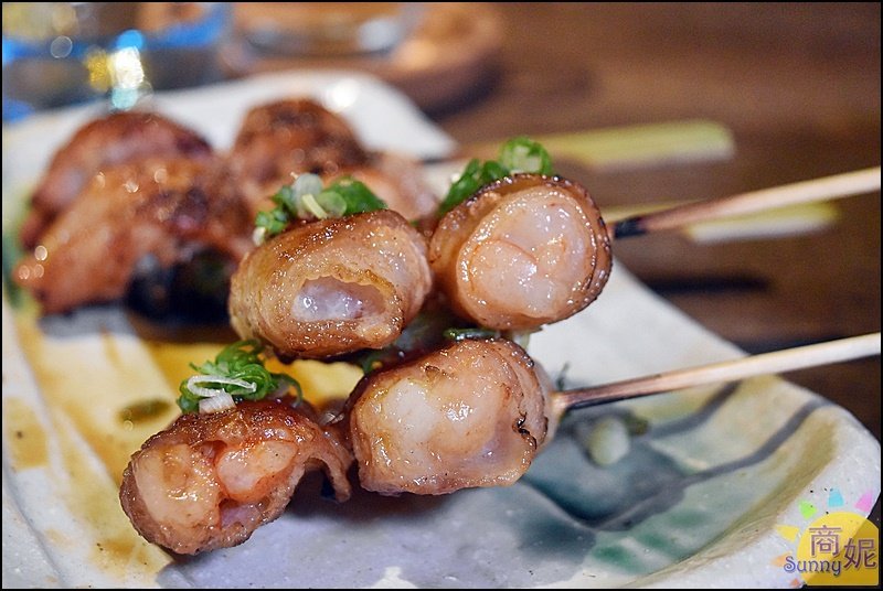 豬五花薄片包捲完整的大蝦仁,又Q又嫩還有鮮甜海味,海老串搭配清酒一起吃真是極品。