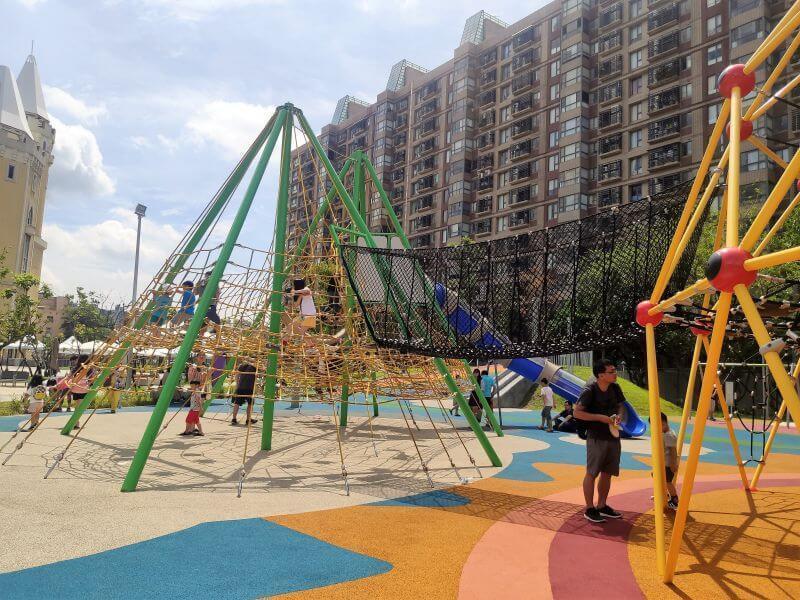 兩個攀爬架中間有個黑色網橋可以相互連接。