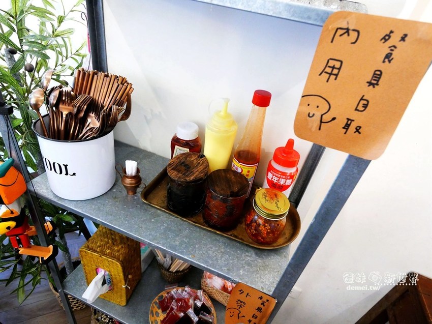 角落架上擺有內外用餐具、醬油&幾款不同辣醬等,飲品甜度不夠的話還有果糖。
