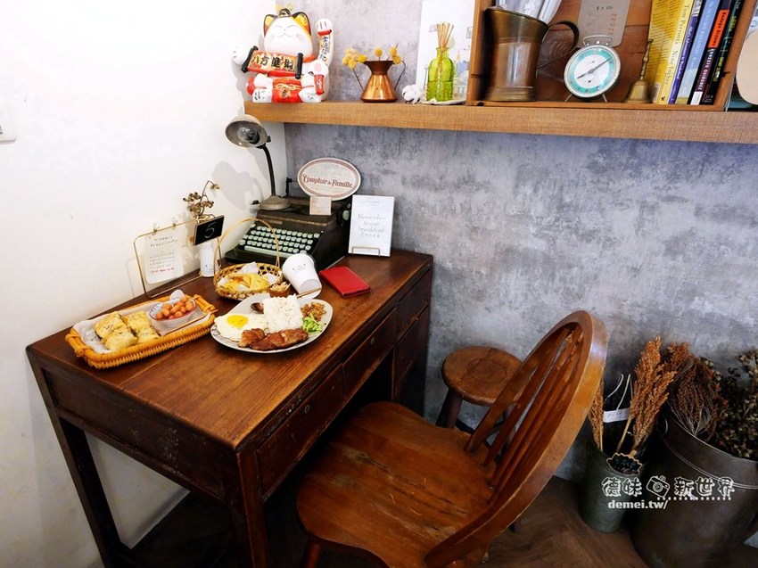 搭配裝飾牆上搖擺老鐘、改良過的縫紉機桌面、角落古老打字機等,