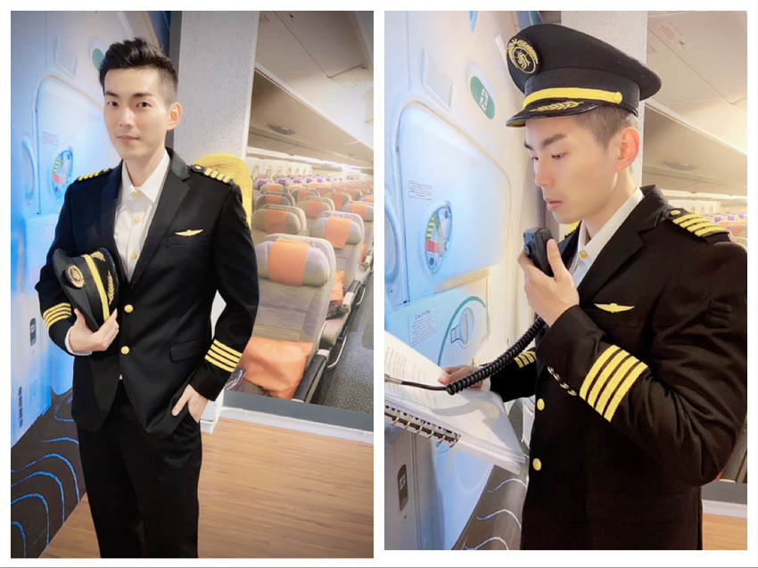 Damon選擇的是英挺的機長裝,配上流利的英文 機長廣播,帥氣爆升一百倍!