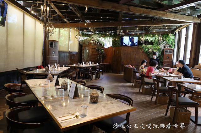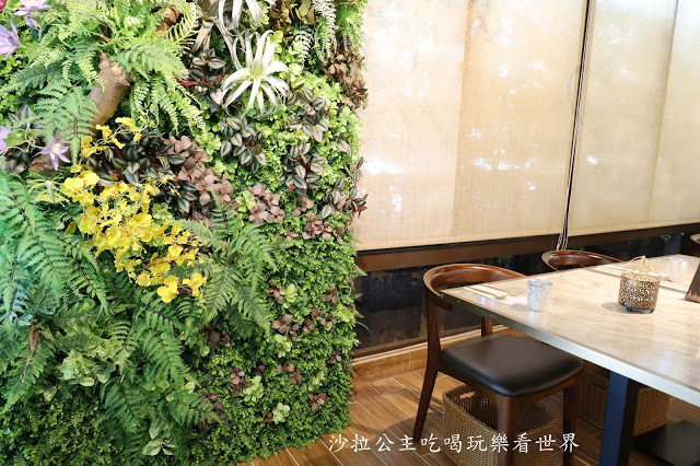 『花園 thai thai』餐廳整體空間設計風格以溫潤木質與大地色系後殖民風格為基調,木紋、大理石、吊燈,營造出南洋度假風情,綠意植栽妝點,白天來有自然採光,晚上昏黃柔和的燈光,打造最舒適自然的用餐環境
