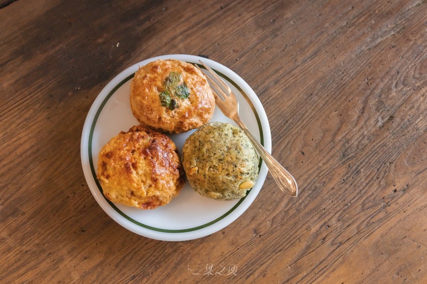 青蔥肉鬆口味絕對是當天嚐的五種口味最喜歡的一款了,沒想過普遍給人英式感覺的司康,也可以搭配如此充滿台灣感的食材,稍微烤熱的司康,在上桌時可以聞到青蔥的香味,一口咬下之後裏頭包覆著滿滿的肉鬆,這樣子的口味組合,讓我想起了小時候最愛吃傳統麵包店的青蔥麵包及肉鬆麵包,對於氣味的回憶就這麼被滿足了。同樣充滿台味的聽說還有油蔥酥口味,這天沒遇到真是太可惜了。