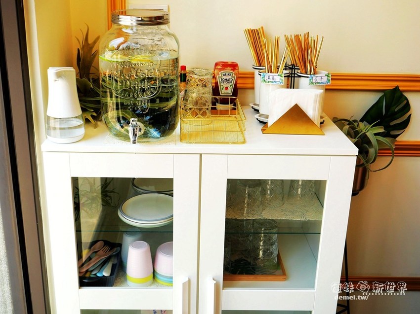 不收服務費,角落櫃上擺有水杯、餐具(下方櫃裡還供有兒童餐具)可自取。