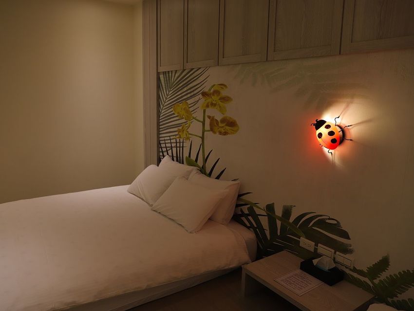 床鋪後牆面 特別繪製了 整面黃花綠草,自然的草木風格~ 瓢蟲造型的小夜燈,點亮了整片牆面~ 妝點出迷人的童趣感!!!