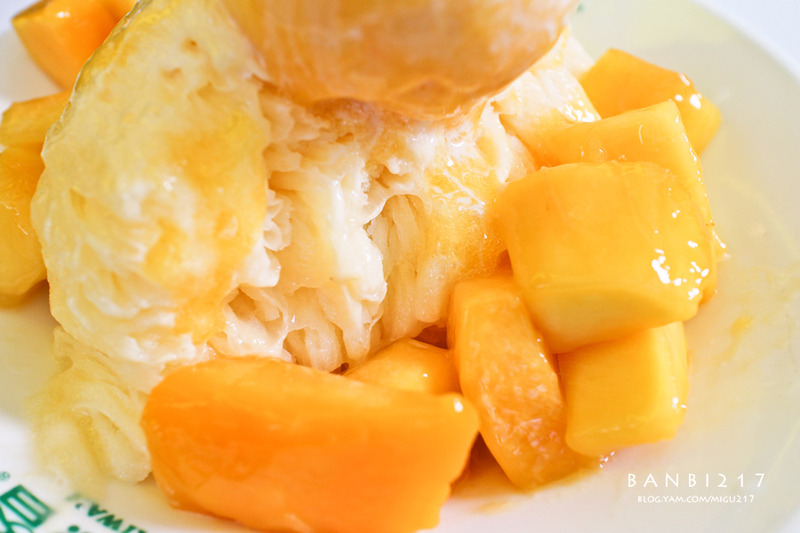 好綿密細緻的雪花冰搭配好滿又好大塊的新鮮芒果肉、芒果雪酪冰淇淋與煉乳,微甜的雪花冰與香甜的芒果肉在搭配與前二者相較下甜度較低的芒果雪酪冰淇淋,讓這碗雪花冰整體是好好吃、好消暑而且又不會太過甜!吃完熱氣全消了,好暢快!