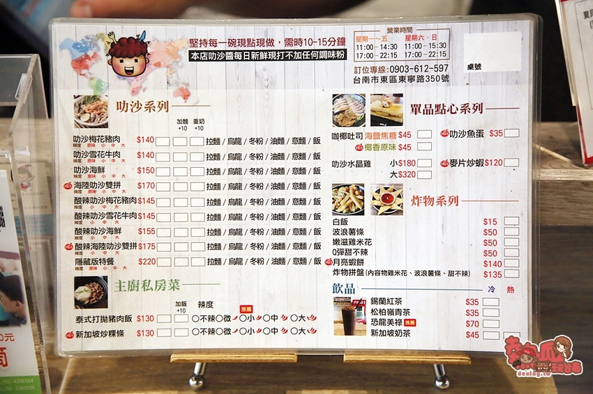 來看看「寶貝老闆新加坡叻沙麵」的菜單,叻沙麵為主要招牌,並有著多種口味及各式麵款可挑選,想吃麵或飯都很可以~這點熱血覺得很棒一次直接滿足了多種選擇,另有主廚私房菜、叻沙水晶雞及南洋風味的咖椰土司及冷飲,熱血之前也有介紹過幾道吃寶貝老闆新加坡叻沙麵,不知道要吃什麼的人,都可以從這裡參考。