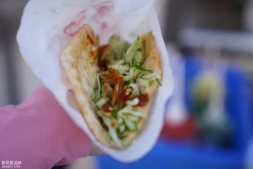 蔥油餅便宜又有特色,加了滿滿滿的小黃瓜、辣椒以及醬油膏和辣醬還有記得加蛋