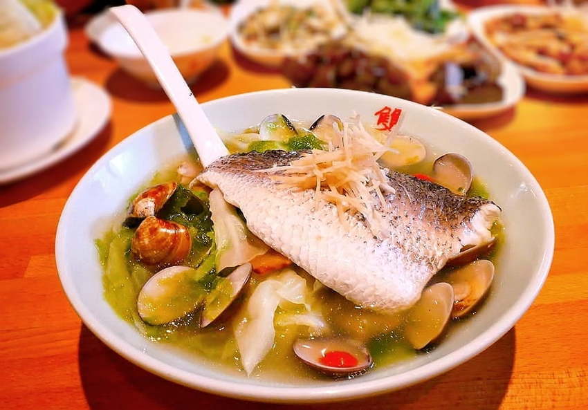 這碗鱸魚湯麵裡面配料超澎湃的.不只有超大台灣鱸魚片.還有澎湖野生海菜.高麗菜.蛤蜊.枸杞等~