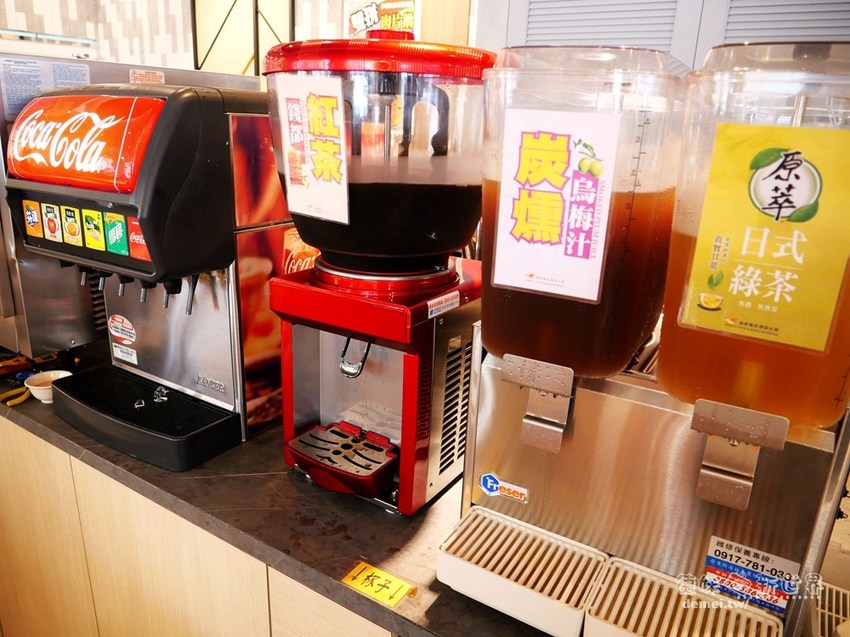 可樂氣泡飲機、紅茶、炭燻烏梅汁、日式綠茶、研磨咖啡機、甜湯。