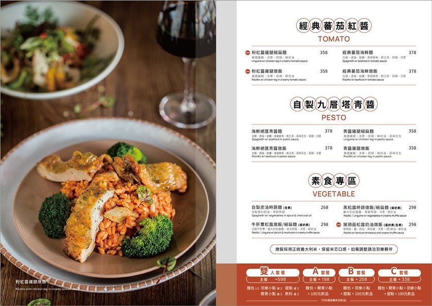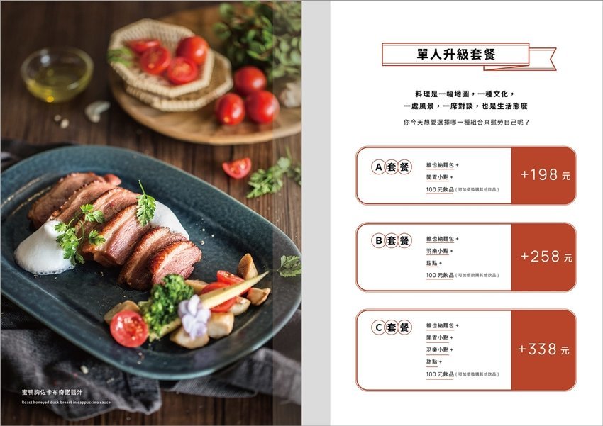 ▼想要吃得飽足又滿足,可以像我們一樣點雙人升級套餐,只要雙主餐加598元,就可以享有維也納麵包x2、羽樂小點x2、開胃小點x2、主餐x2、甜點x2、飲料x2,真的很划算呢!單人也可以加價升級套餐,有A套餐+198元、B套餐+258元、C套餐+338元三種,大家都可以視個人喜愛來選擇!